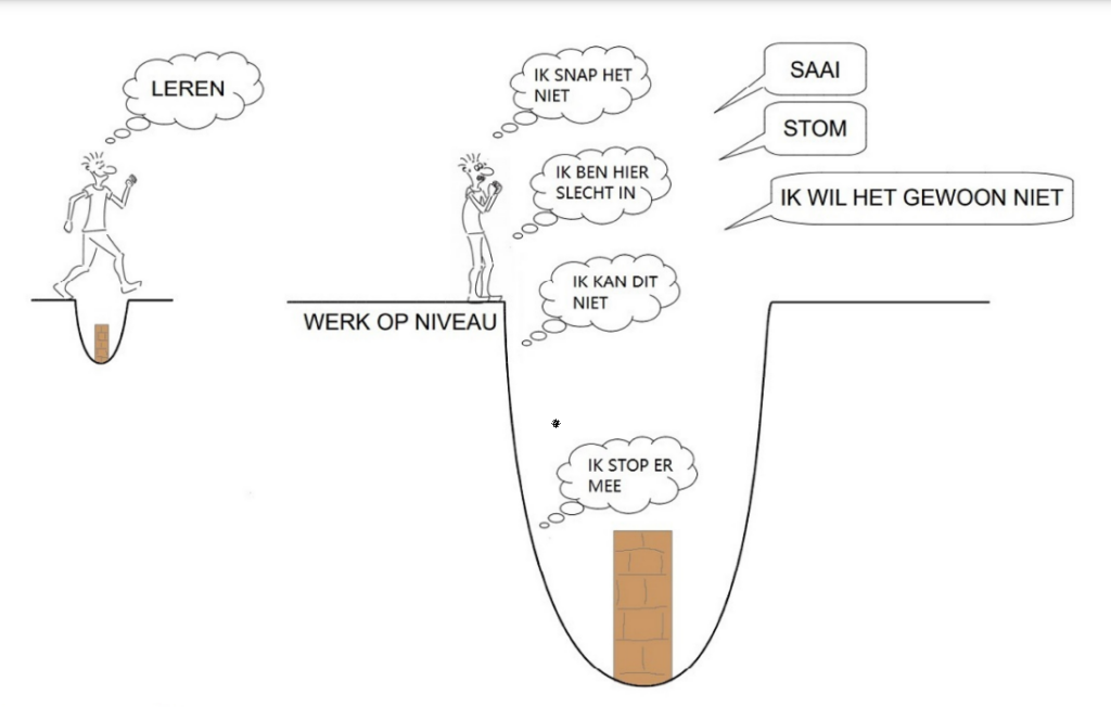 Er wordt ook gewerkt met een persoonlijk leerdoel zoals bijvoorbeeld leren fouten durven te maken, samenwerken, van A tot Z leren werken, meer zelfvertrouwen, veerkracht, emoties of gedachten beheersen, jezelf meer uitdagen of laten zien, minder stress of perfectionisme ervaren, etc. We gaan op zoek naar een leerkuil en begeleiden elkaar daar liefdevol, in een veilige omgeving doorheen om succeservaringen op te doen. Veel activiteiten staan in het teken van ‘leren denken’, ‘leren onderzoeken’, ‘leren wie je bent’, ‘leren leren’, en een stukje ‘leren ondernemen’. Het doel is uiteindelijk een goede transfer naar de klas te kunnen maken waarbij de leerling weet en aan kan geven wat hij of zij nodig heeft om in de leerbehoefte te kunnen voorzien, en soms onderpresteren of demotivatie kan voorkomen.